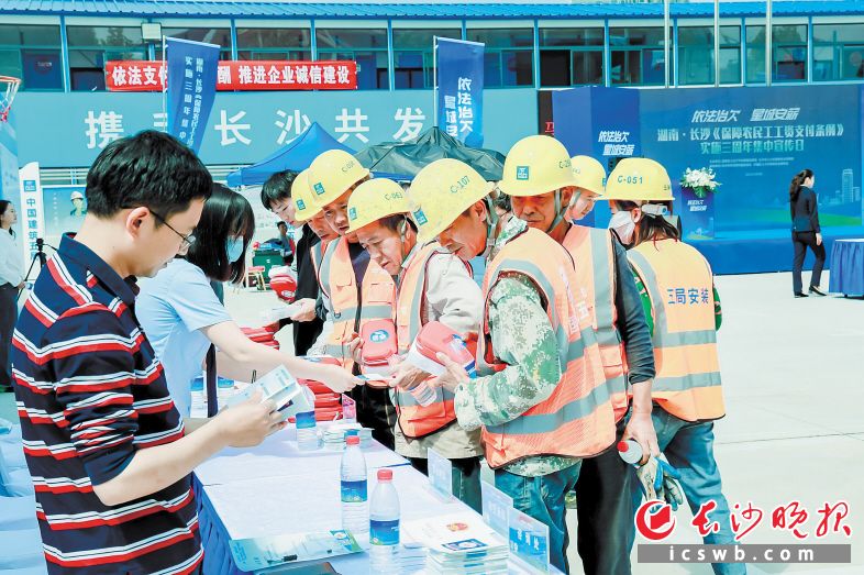 长沙晚报5月9日讯(全媒体记者 李静 通讯员 刘激扬)今年“五一”是《保障农民工工资支付条例》实施三周年。9日,长沙市人社局在中建五局中南国家数字出版基地马栏山园区建设项目上举行《条例》实施三周年集中宣传日活动,通过交流、参观、咨询等方式,为全市建筑业企业和农民工送上普法“大礼包”。