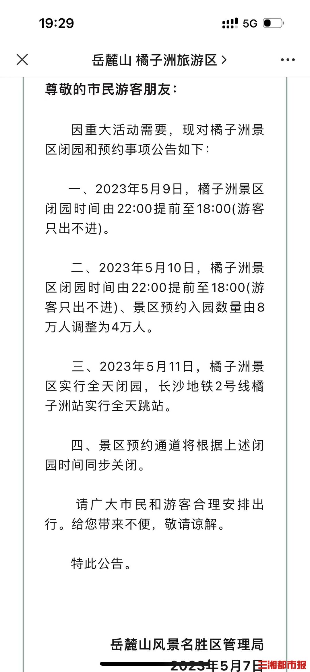 三、2023年5月11日,橘子洲景区实行全天闭园,长沙地铁2号线橘子洲站实行全天跳站。