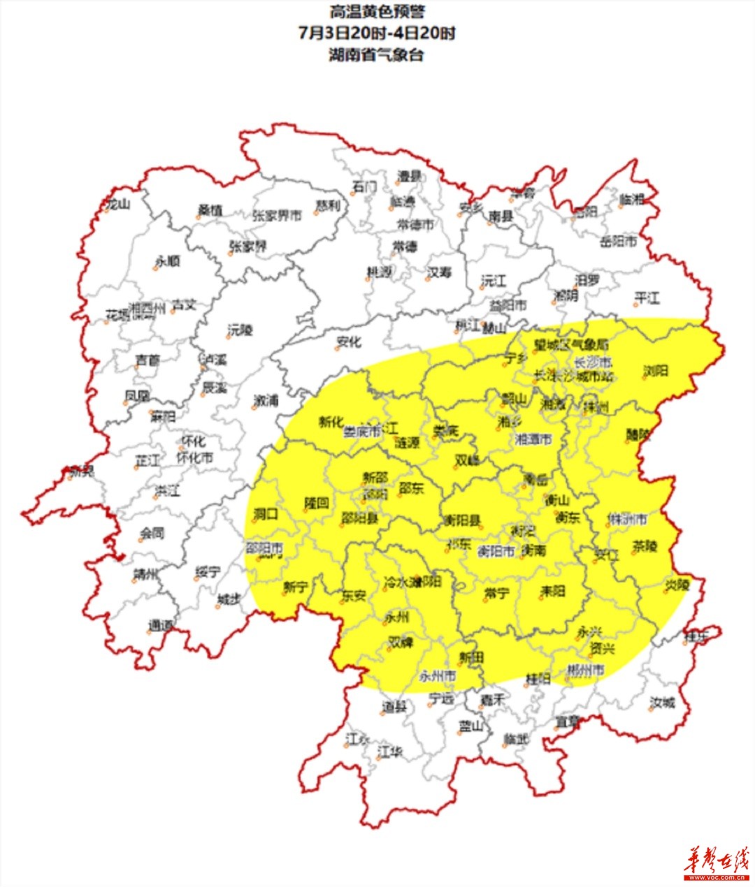 华声在线7月3日讯(记者 赵瞳铱 通讯员 林城)湖南省气象台7月3日16时发布高温黄色预警:预计3日20时至4日20时,长沙、株洲、湘潭、衡阳、邵阳、郴州北部、永州北部、娄底将达到35℃以上高温,局部地区将达37℃以上,请做好防范。