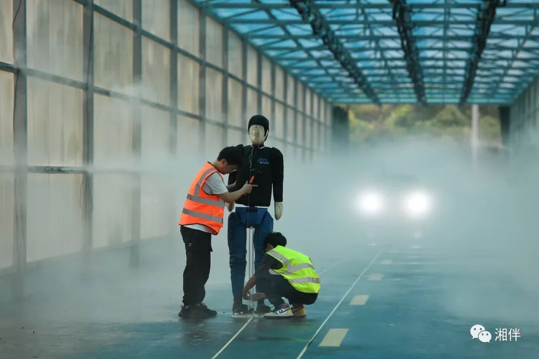 国家智能网联汽车(长沙)测试区,实验舱内正在进行智能驾驶汽车雨雾天气行人纵向环境测试。 湖南日报全媒体记者 傅聪 摄