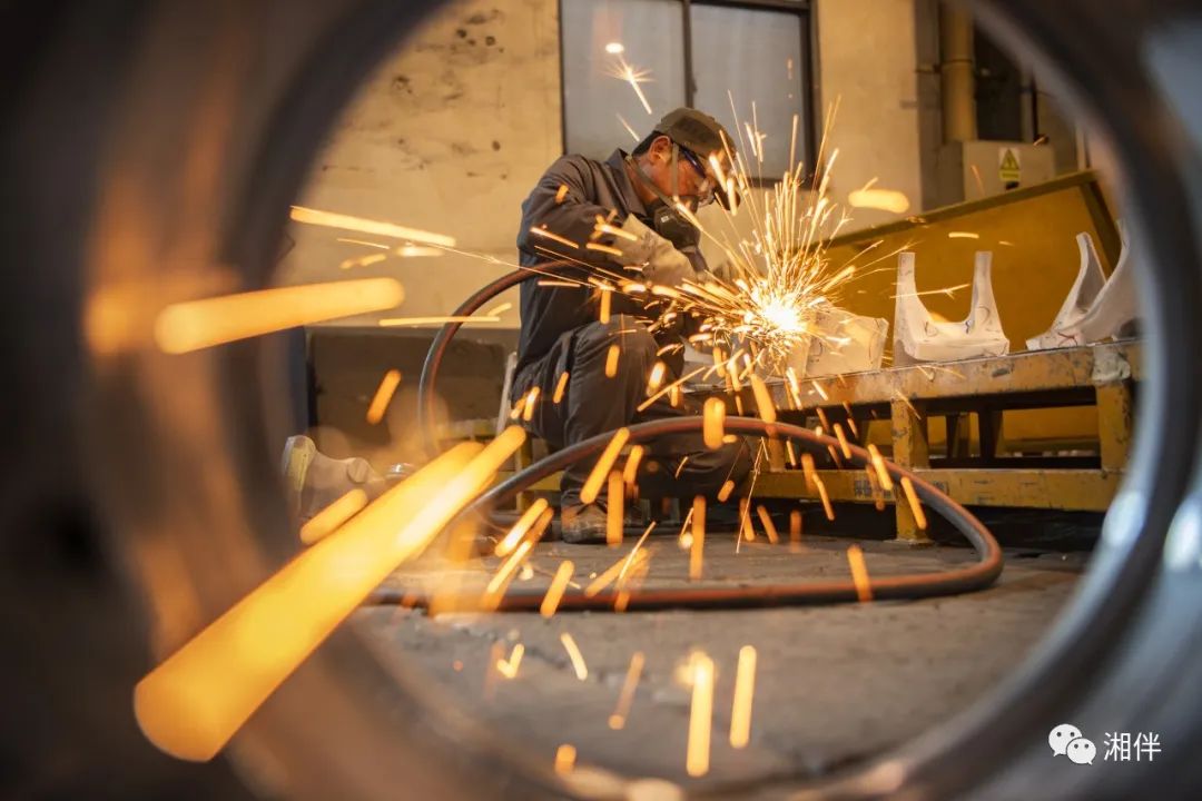 株洲九方装备股份有限公司生产车间,工人在打磨列车牵引座。 湖南日报全媒体记者 李健 摄