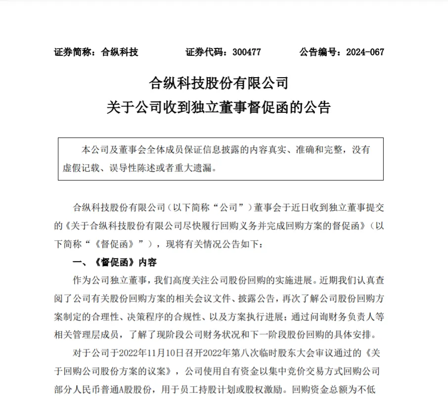 有意思的是,合纵科技因回购事宜收到了独立董事提交的督促函,督促公司尽快履行回购义务并完成回购方案。截至2024年5月31日,合纵科技累计回购公司股份数量为140.3万股,累计回购金额499.94万元,与回购方案约定的不低于2000万元的下限金额存在差距。6月20日,公司再发公告称,此次回购股份方案全部实施完毕,符合公司既定的回购方案。