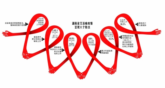 方亦兵介绍,截至2012年10月31日,全省累计报告艾滋病病毒感染者和艾滋病人15971例(死亡4819例),其中报告艾滋病病人6989例(死亡2546例)。2012年1至10月报告艾滋病病毒感染者2813例(其中艾滋病病人998例),较去年同期上升30.6%,是我国艾滋病防治重点省份之一。累计报告病例排前五位的地区依次是衡阳市、永州市、怀化市、长沙市和邵阳市。
