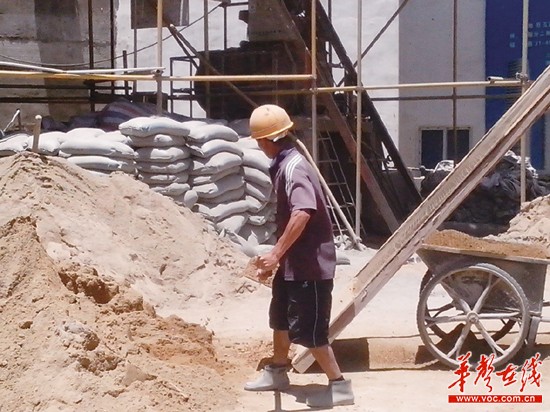 记者又来到长沙湘江中路一工地。蔡师傅正在烈日下搅拌水泥, “我从武汉来这边已有四五个月了,从早上7点到11点半,下午1点半到6点,晚上加班到9点,每天都是这样。”63岁的蔡师傅头发几近花白,布满皱纹的脸黝黑黝黑。