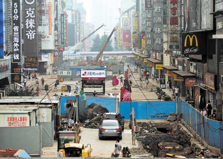 2011年以来,因为修建地铁1号线黄兴广场站和南门口站的需要,步行街不得不围挡施工。“最高峰时838米长的步行街,有三分之二的路面被围挡。”黄兴南路步行街管委会主任于晓春介绍,目前的围挡集中在南门口、黄兴广场、司门口,都是步行街人流进出的主要通道。
