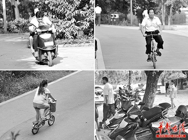 9月16日下午,湖南烈士公园,一些行人骑着自行车或电动车(非园内工作用车)在园内穿行。虽然该公园明令禁止社会车辆(含电动车、自行车、成人用折叠自行车)入园,但仍有人钻空子骑车入园。 记者 田超 摄