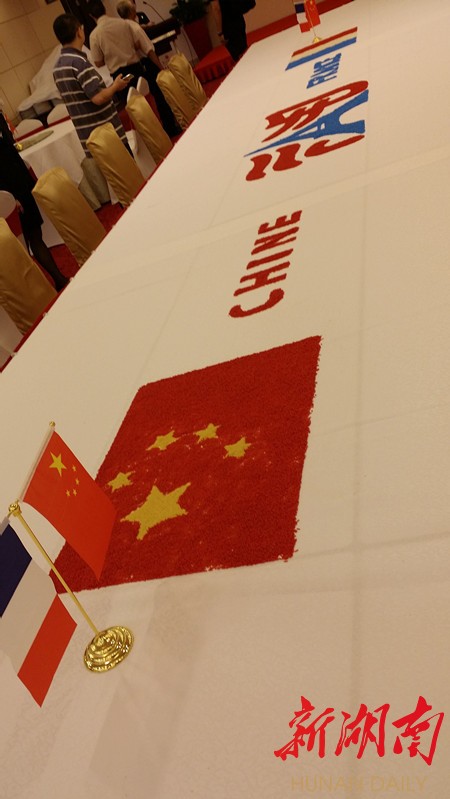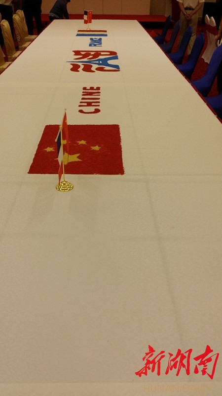 走进设在巴黎华天中国城酒店的“湖南味道”展厅,“湘”味抢眼。铺着白色桌布的长条桌上,染成红色、黄色和蓝色的湘米被摆成中、法国旗和活动标志。27日晚,湘菜大师将为法国友人端上精心烹饪的“湖南味道”,与法国美食家共同品鉴。