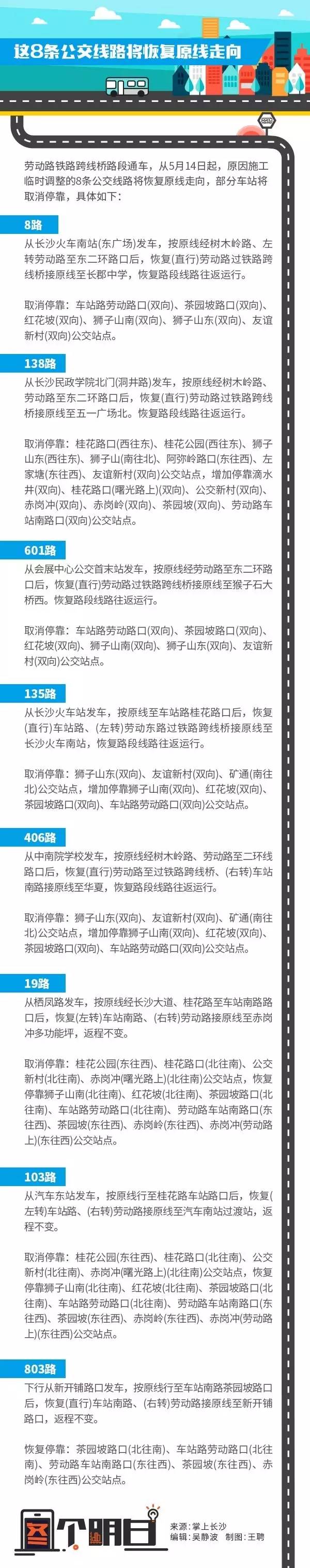 长沙晚报讯(记者 吴鑫矾 通讯员 王琦)昨日,记者从长沙市道路运输管理处获悉,随着劳动路铁路跨线桥路段通车,从5月14日起,原因施工临时调整的8条公交线路将恢复原线走向,部分车站将取消停靠,有出行需求的市民请留意。