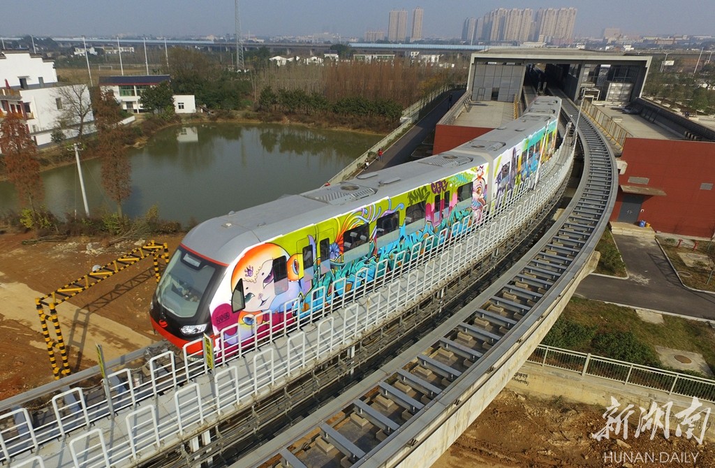 2016年12月15日上午,画满涂鸦的磁浮专列。列车两面的作品由来自国内外的20位涂鸦大师联手创作,突出展示城市幸福感和轨道交通的绿色发展理念。 湖南日报记者田超 通讯员陈巧玲 摄