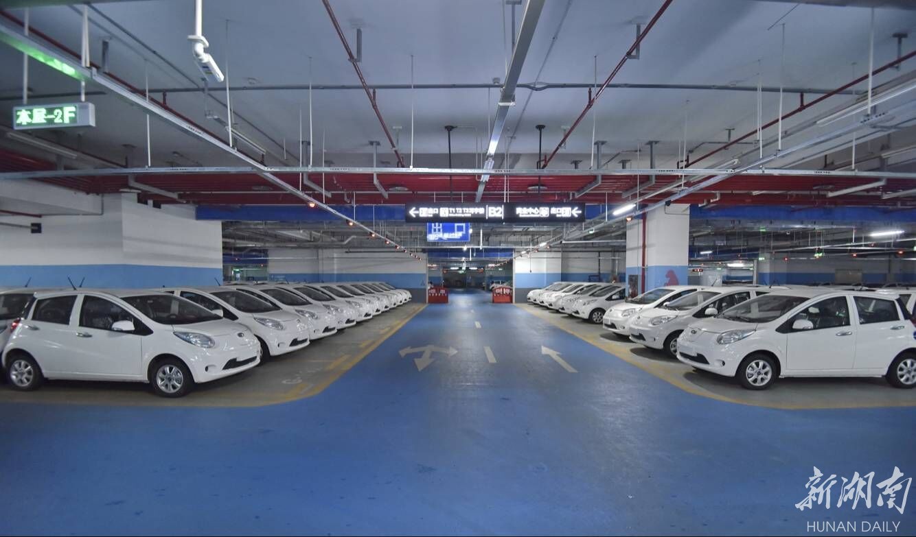 ▲新一批“先导快线”共享汽车在长沙西中心地下停车场整装待发。
