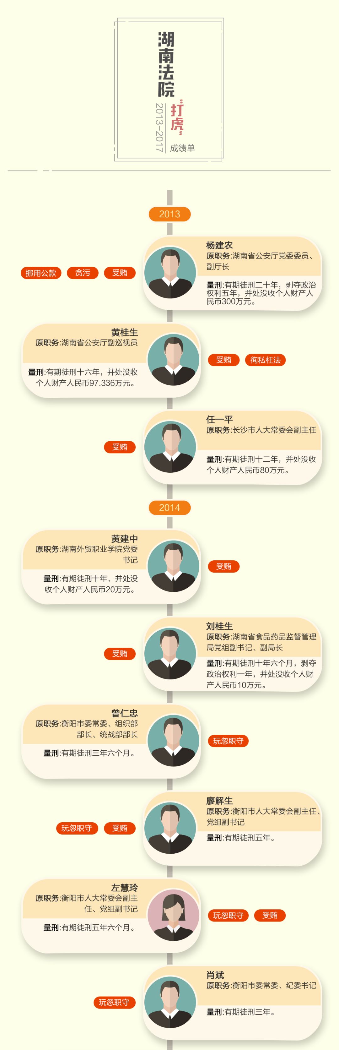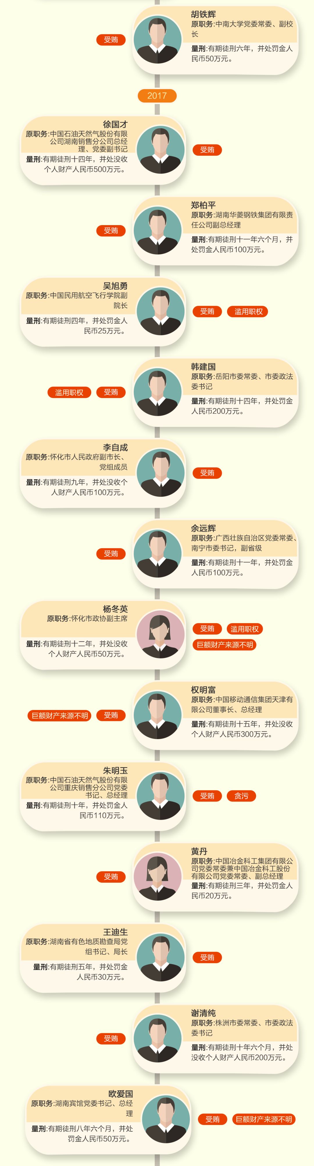 编者按:在今年的湖南高院工作报告中,披露了2013年—2017年湖南法院审结的46名原厅级以干部职务犯罪的情况,引人注目。五年来,湖南法院审结贪污受贿等职务犯罪案件4513件6442人,其中原为厅级以上职务46人、处级职务383人。