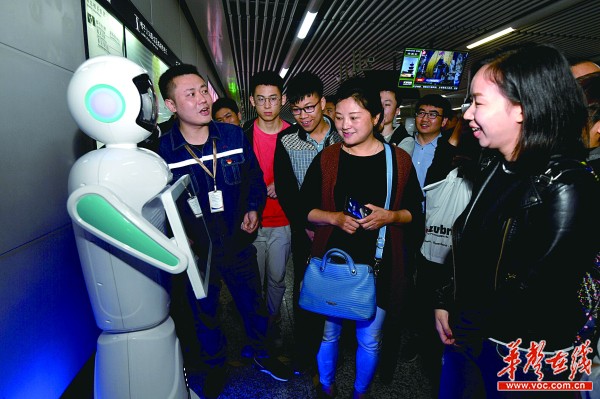 4月26日上午,长沙地铁2号线橘子洲站,市民在体验与智能机器人互动。 记者 田超 摄