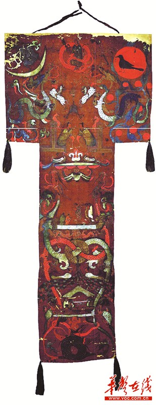 文物解析:这幅彩绘帛画是迄今发现最精美、最具代表性的一幅西汉早期墓葬绘画作品。帛画外形像一个大写的英文字母“T”,故后人称之为 T形帛画。但根据随葬遣册的记载,其名为“非衣”,可能是取其“似衣而非衣”之意。帛画由三块单层细绢拼接而成,顶端裹有横向竹竿,其两端系以丝带,可能是出殡时作为引导的“魂幡”。入葬时覆盖于内棺棺盖表面。