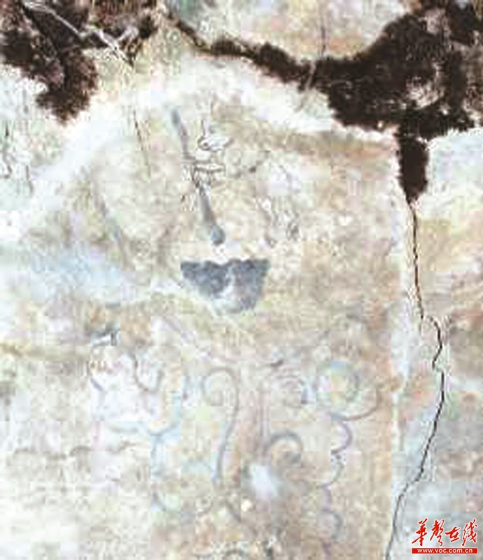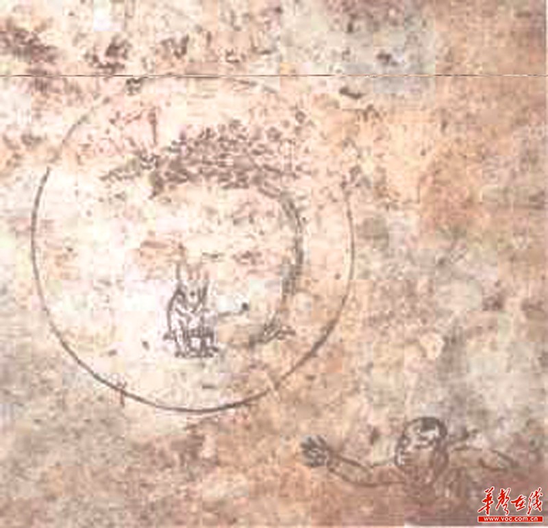 文物解析:两幅月中画有玉兔捣药的壁画,一个位于新邵县(左上图),一个位于桂阳县(左下图),并且月亮在墓中被描绘的位置不同。两个月亮都是画的圆月,但具体表现上,新邵县宋代壁画墓将流云与圆月相组合,增加了画面的纵深感,而桂阳刘家岭宋代壁画墓上的圆月相对独立,虽然月下画有似乎正在飞升的仙人,但是与圆月还是保持了一定的距离。