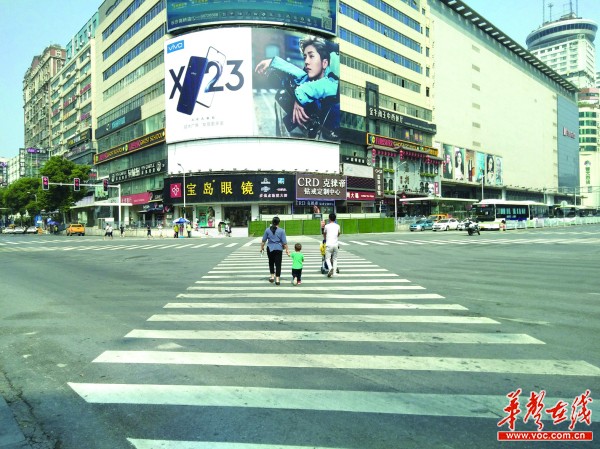 9月16日,周末的长沙司门口人头攒动,解放路、黄兴路车流量大,两条在路口中间交叉的对角斑马线格外显眼。