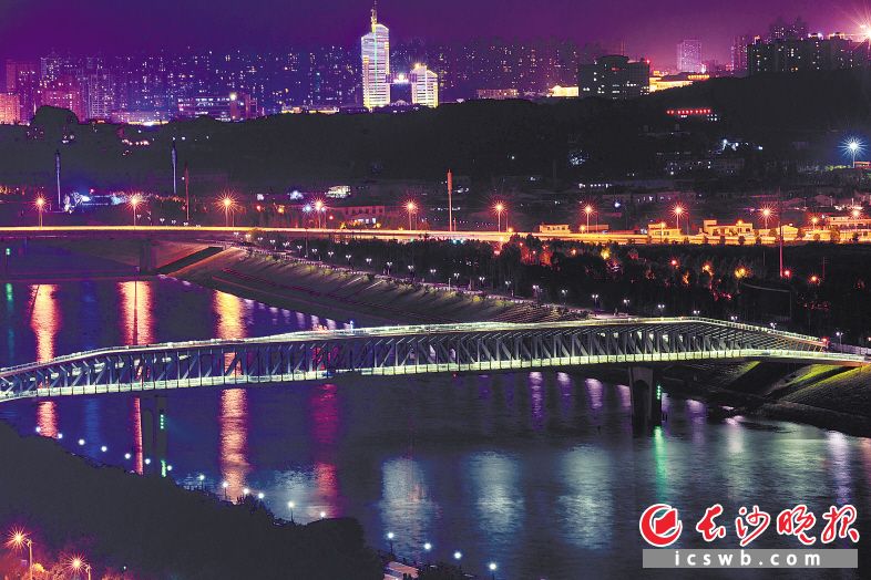 昨晚,不少在浏阳河风光带散步的市民惊喜地发现,连接浏阳河东西两岸的核心景观汉桥开始试亮灯,汉桥外观呈月牙形,其钢质梁架立体筑列,远看宛若条条琴弦,在水面上营造出“浏水无弦万古琴”的雅意。其月牙形的平面外观,暗合长沙童谣“月亮粑粑”的意蕴。长沙晚报记者 陈飞 摄