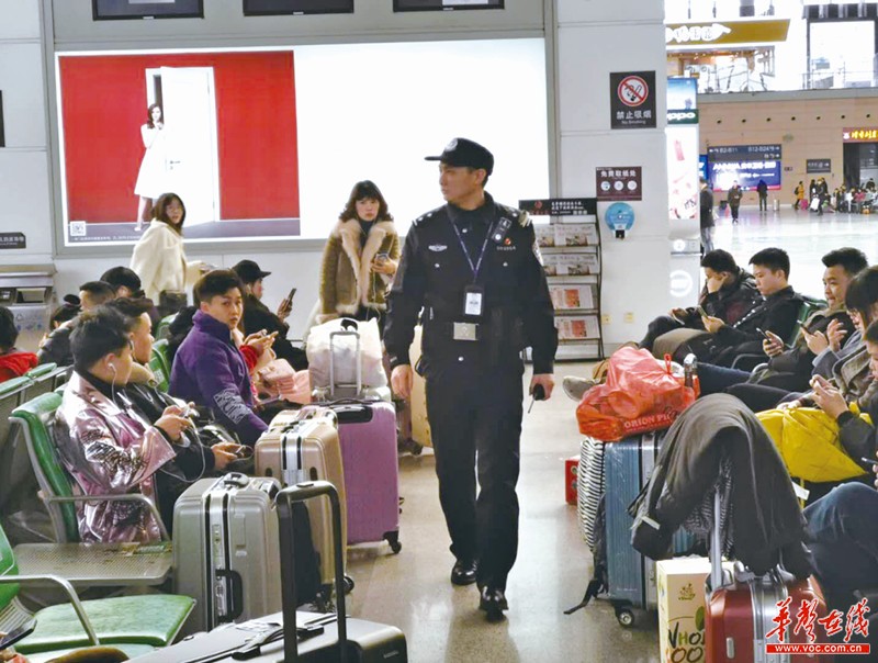 春节假期对于长沙火车南站的“80后”小伙骆帅杰来说,是同往常一样的工作日。自2012年入警以来,他一直坚守岗位守护旅客平安回家。图为他在车站巡视。 通讯员 张威 摄