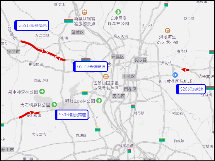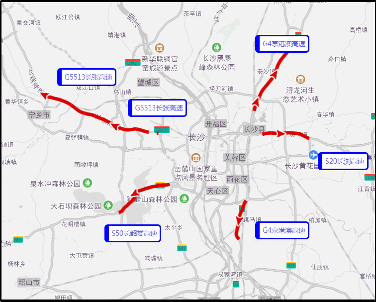 根据交通大数据预测,十一期间长沙市出城易拥堵缓行的高速主要是G5513长张高速、G50长韶娄高速等高速的部分路段;