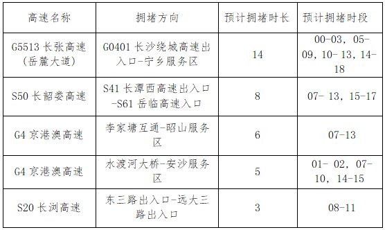 预计10月6日长沙市周边返程流量集中高速路段
