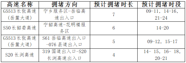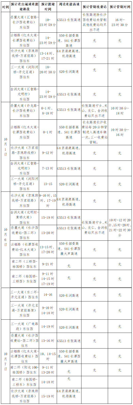 城区主要进、出城道路方面,预计从节前一天(9月30日)下午14时开始,长沙城区连接周边高速的出城道路车流量将持续较长时间的增长,当天进入高速需要领卡或者ETC通行,所以车辆进入高速较为缓慢。例如:连接长张高速的岳麓大道、连接长潭西及长韶娄高速的云栖路等;10月6日上午10时开始,个别返程道路流量将逐步上升。具体情况如下表: