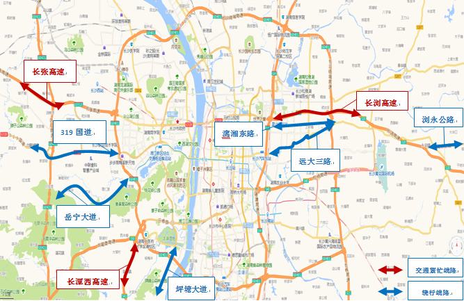1、长张高速长沙段。车辆分别通过与长张高速平行的金洲大道(益宁城际干道-前往益阳)、319国道(黄桥大道-319国道-前往益阳)、岳宁大道(泉水路-岳宁大道-前往宁乡)绕行,避开拥堵路段。特别是在假期每天9-11时和14-17时等车流高峰时段。