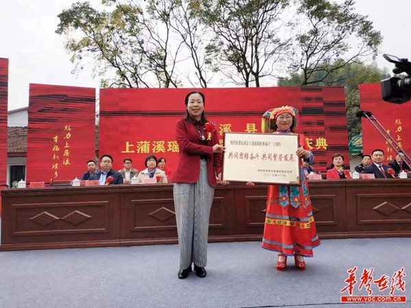 湖南省民宗委政策法规处处长尚光菊(左)向上蒲溪瑶族乡授牌。