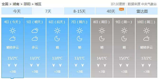 湘西北多云转小雨,其他地区晴天转多云;北风2~3级;最高气温湘西13~15℃,其他地区15~17℃;最低气温湘西5~7℃,其他地区2~4℃。