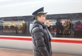 1月14日,长沙火车南站,在站台上工作的邹玉洁。图/记者张云峰