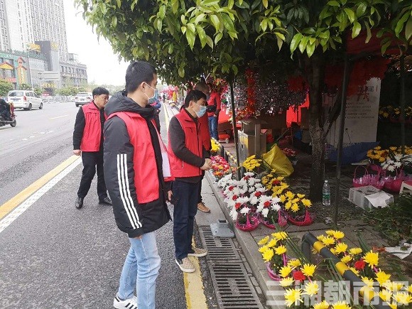 (长沙市天心区金盆岭街道赤岭路社区志愿者正在开展清明志愿服务。)
