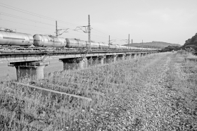 ②昭山晴岚路旁,沥青厂的专线,有古旧钢铁桥,也有百年老铁轨。图/卢七星