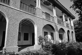 洋楼在城西最南端的三角坪贮木场内,知道具体地址,寻找却并不那么容易,我们拿着洋楼的照片在贮木场打问,多数人一脸茫然的样子。知晓的老人坚持认为,那是苏联人建的房子。我们在贮木场内的一座不高的山上遥遥望见了那栋与众不同的房屋。走近才发现,山上并不像看起来那么荒凉,周边有低矮的房屋,有人居住,主人外出,几条狗却忠实地守护着自家的院子,一个劲地吼叫。开垦的菜地被拾掇得井井有条。四周环以回廊。一层回廊柱之间作成券,上下两层均铺设木地板。二层廊柱为双罗马柱,单檐四坡顶,外墙为水泥混凝土涂抹糙面,极其厚实。外墙有楼梯直通二楼,两根铁轨竖立在楼梯旁,像是提醒着人们,这座房子,跟铁路相关。