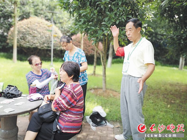 “罗爹,来搞锻炼了!”在晓园南门一侧健身区,有人远远向大步走来的一位老人热情打招呼。这位罗爹是晓园“市民园长”团队成员之一,也是晓园健身群体的“常客”,名叫罗国珊,今年79岁,是地道长沙人,退休前搞过工程技术,也干过行政。爱好健身的他身板硬朗,看起来比同龄人年轻不少。当日,他和搭档王淑琴到岗,开始了一天的轮值。