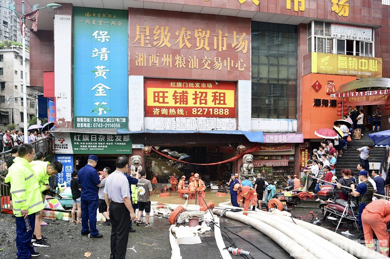 7月8日11时许,长沙市消防救援支队驻湘西保靖重型地质灾害搜救队接到前方指挥部调度,吉首市红旗门大市场发生内涝事故,驻保靖重型地质灾害搜救队立即出动两车13人携带器材装备赶赴现场处置。