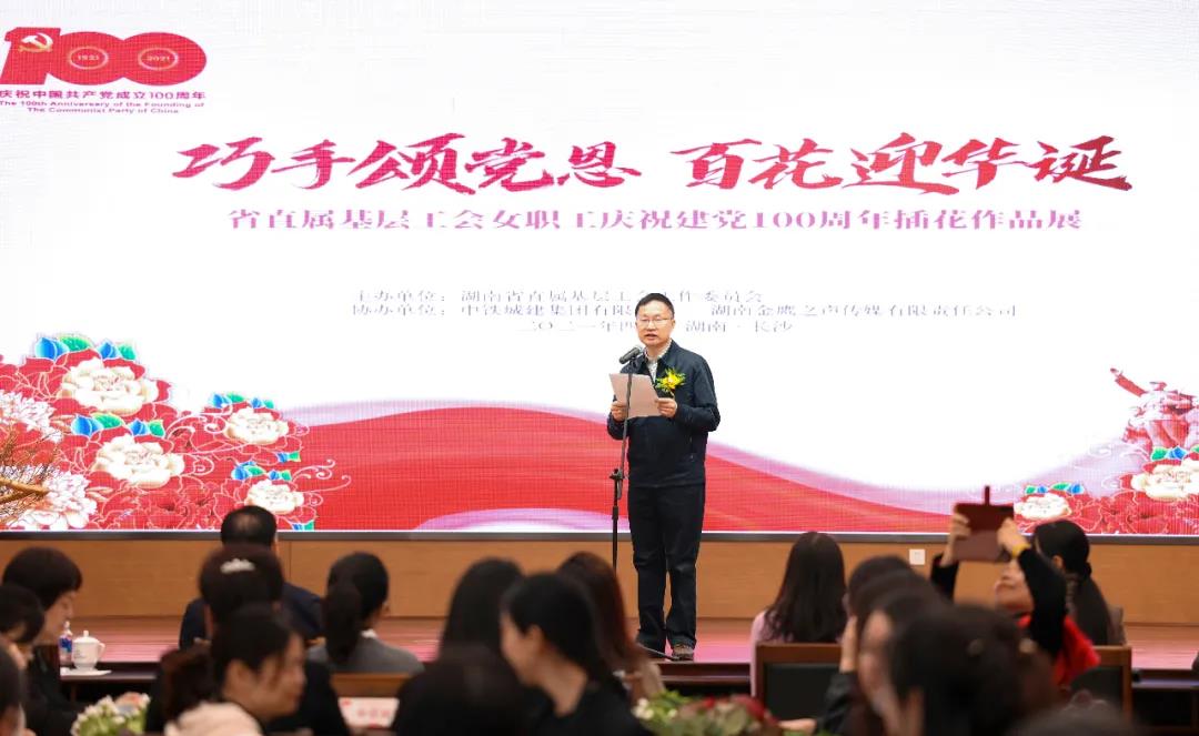 此次活动由湖南省直属基层工会工作委员会主办,中铁城建集团及湖南金鹰之声传媒有限公司协办。湖南省总工会二级巡视员田良玉,中铁城建集团党委书记、董事长罗海滨,党委副书记、工会主席、女工委主任邱卫,湖南省直工委主任陈国良,副主任、机关工会主席、中国插花协会资深讲师邹红梅,四级调研员马翼,金鹰955电台副总监张芸出席开幕式并共同为活动启幕。