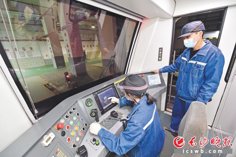 地铁列车的司机室内,检修工人对着各类设备进行性能检查。司机室是地铁列车的“大脑”,容不得半点马虎。均为长沙晚报全媒体记者 王志伟 摄