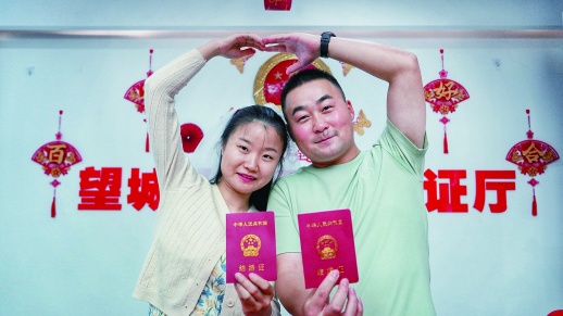 5月20日,一对新人在长沙市望城区民政局领到结婚证后,用手做了一个心字,表示真心相爱,生生世世在一起。
