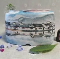 选泥、上色、烧窑、晾干、作画,和普通的陶器烧制不同,谭先岐的作品多了作画的步骤。风景、人物、花鸟……在他的手下跃然陶器之上,成为在外游子梦中家乡的模样。