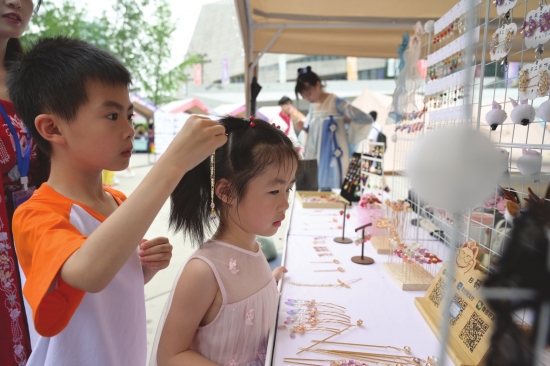 6月3日,长沙滨江文化园文化广场,一位小男孩在文旅集市上给妹妹挑选发簪。图/记者吴琳红