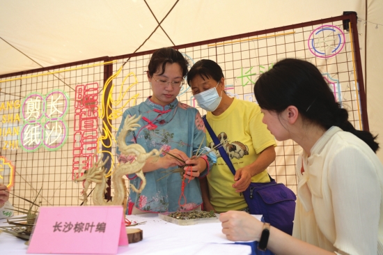 6月3日,长沙滨江文化园文化广场,市民体验长沙棕叶编。图/记者吴琳红