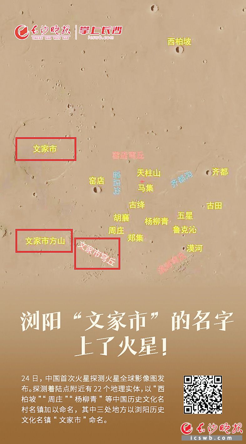 长沙晚报4月24日讯(全媒体记者 颜开云)24日,在2023年“中国航天日”主场活动启动仪式上,国家航天局和中国科学院联合发布了中国首次火星探测火星全球彩色影像图。值得一提的是,中国标识被永久刻印在火星大地——探测着陆点附近有22个地理实体,以“西柏坡”“周庄”“杨柳青”等中国历史文化名村名镇加以命名,其中三处地方以浏阳历史文化名镇 “文家市”命名。