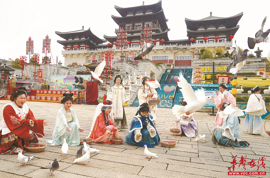 3月22日,长沙铜官窑国风乐园,“花仙子”在放飞鸽子。当天,该园融合千年窑文化与花朝节传统风俗举办花朝游园节活动,通过国色芳华大巡游、汉服美拍映花颜、非遗演艺传古韵等系列活动,让游客沉浸式感受传统花朝节的文化魅力。