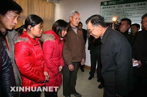 1月29日,中共中央政治局常委、国务院总理温家宝在湖南长沙看望在沙坪变电站除冰抢险中不幸殉职的周景华、罗长明、罗海文3名电力职工的家属。温家宝总理说:“今天面对你们,我无法用更多的语言来表示安慰,我给你们鞠个躬吧!”新华社记者 姚大伟摄