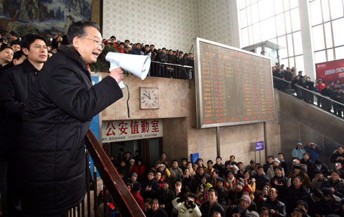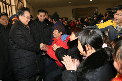 下图:1月29日,中共中央政治局常委、国务院总理温家宝在湖南长沙火车站看望滞留车站的旅客。温家宝总理对旅客说,春节快到了,我给大家拜个早年。你们被困在火车站,还没能提早回家,我表示深深的歉意,现在我们正在想尽一切办法抢修,一定把大家送回家过春节。新华社记者 姚大伟 摄
