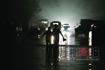 昨晚8点左右,107国道先锋村向公塘组路段,一对情侣试图赤脚通过被淹的道路。本版图片/记者刘有志