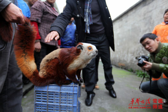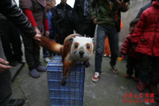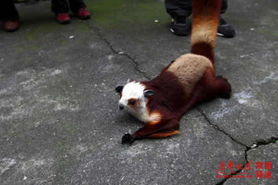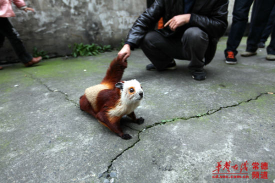 “小家伙一天不吃不喝,我们担心它会饿死。”昨日上午,记者来到厂区,李师傅取出了这只重约2.5公斤的小家伙。小家伙全身毛色光鲜,有棕、白、黄多种颜色,爪子十分锋利,全身长约1米,尾巴的长度占了一半。它头部像猫,体型又像松鼠,皮毛像貂,倒提着尾巴时,又像是一只蝙蝠,居民们戏称它为“四不像”。