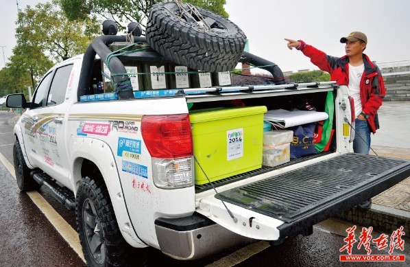 11月15日,长沙市湘春路路口,黄海涛向记者介绍载着他们环球旅行的皮卡车。 实习生 李健 摄