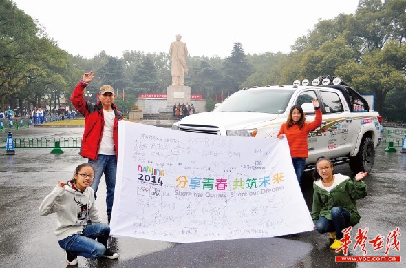 准备了两年半,今年7月1日,四个人从南京出发了,“这次到长沙,国内的行程也就接近尾声了,这相当于先练练兵吧。回去之后,我们会休整一段时间,把出国的护照、签证等事宜办好之后再开始环球之旅。”黄海涛说。