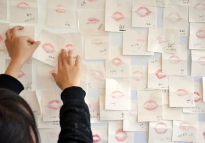 (工作人员把顾客献的吻贴在墙上。)