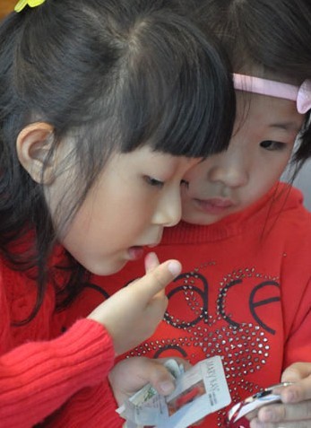 (两个小女孩也在献吻,她们想要得到那份礼品。)