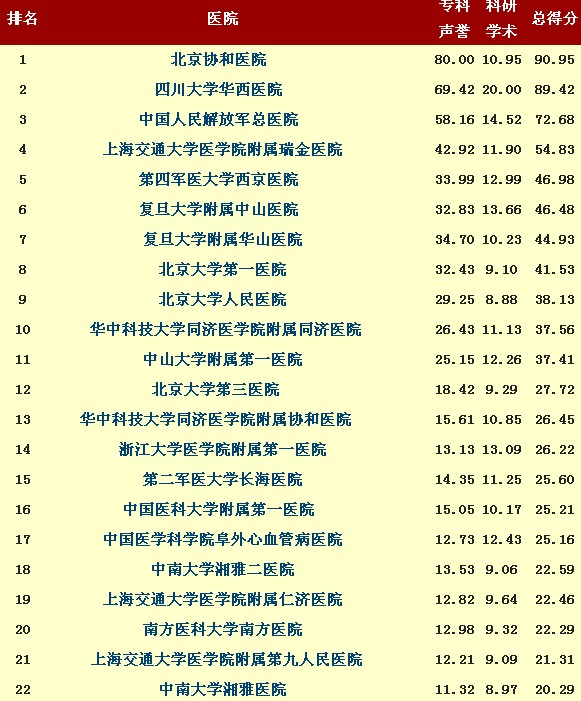 在去年公布的“2010年度中国最佳医院综合排行榜”中,前三名和今年相同,上海也是这3家医院进入前10位但排名略有不同,瑞金医院、华山医院和中山医院分列第4、第5及第8位。